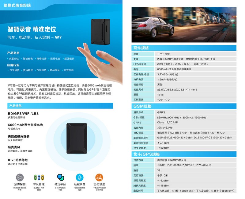 W1是一-款專門(mén)為個(gè)人用戶而設(shè)計(jì)的便攜式定位終端,內(nèi)置1200mAh聚合物鋰電池,可通過(guò)USB循環(huán)充電。體積小巧,便于隱蔽安裝。同時(shí)融合GPS/北斗衛(wèi)星定位以及GPRS通訊技術(shù),具有實(shí)時(shí)定位追蹤、軌跡回放、遠(yuǎn)程錄音等功能適用于個(gè)人定位、私人定制等需求。