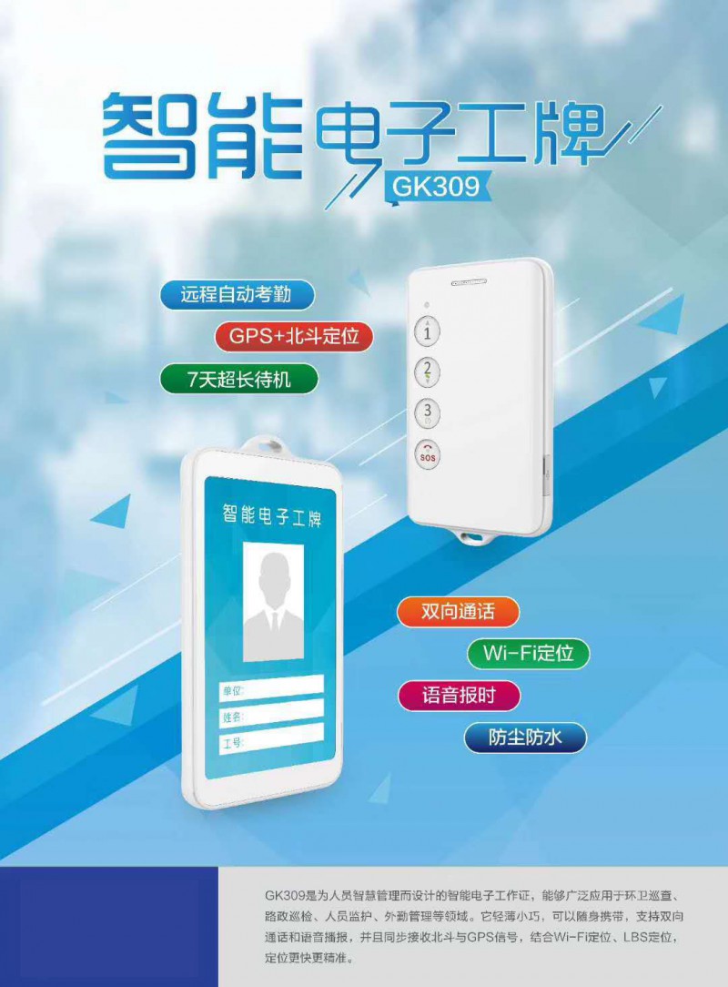 工卡定位器GK309是為人員智慧管理而設(shè)計(jì)的智能電子工作證,能夠廣泛應(yīng)用于環(huán)衛(wèi)巡查、路政巡檢、人員監(jiān)護(hù)、外勤管理等領(lǐng)域。它輕薄小巧,可以隨身攜帶,支持雙向通話和語音播報(bào),并且同步接收北斗與GPS信號(hào),結(jié)合Wi-Fi定位、LBS定位,定位更快更準(zhǔn)。
